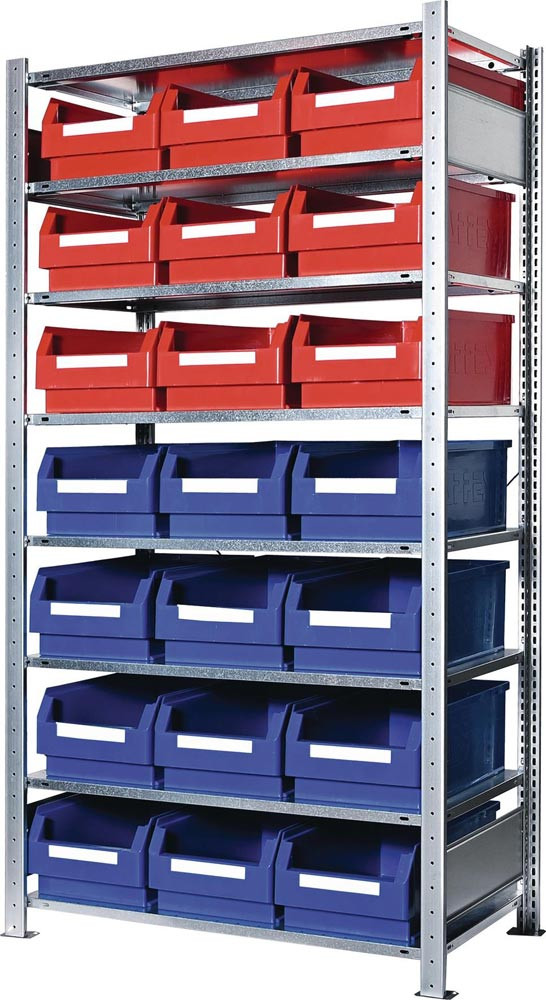 Steckregal H2000xB1000xT500mm Grundregal 8 Stahlböden 9 x Gr. 2 blau, 12 x Gr. 2 rot