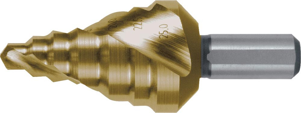 Stufenbohrer Bohrbereich 6-25 mm HSS TiN spiralgenutet Schneidenanzahl 2 Stufenanzahl 7