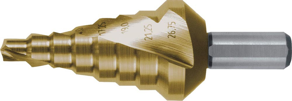 Stufenbohrer Bohrbereich 6-26,75 mm HSS TiN spiralgenutet Schneidenanzahl 2 Stufenanzahl 8
