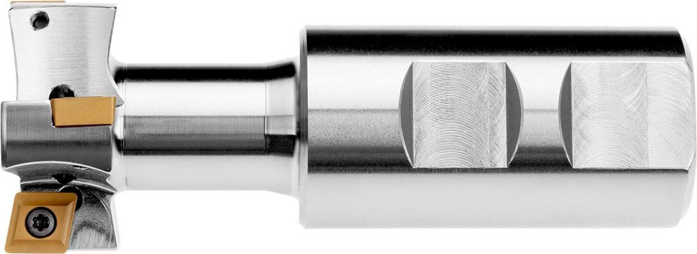 T-Nutenfräser zum spannen von 2 Stück CCMX 08T308 einseitigen Wendeschneidplatten · Schnittdurchmesser 32mm mit 90° Anstellwinkel und 32mm Weldon Schaft gemäß DIN 1835B · 98mm Gesamtlänge · Kühlkanalbohrung zum T-Nutenfräsen und rückseitiges Fräsen mit einer maximalen Schnitttiefe von 14mm