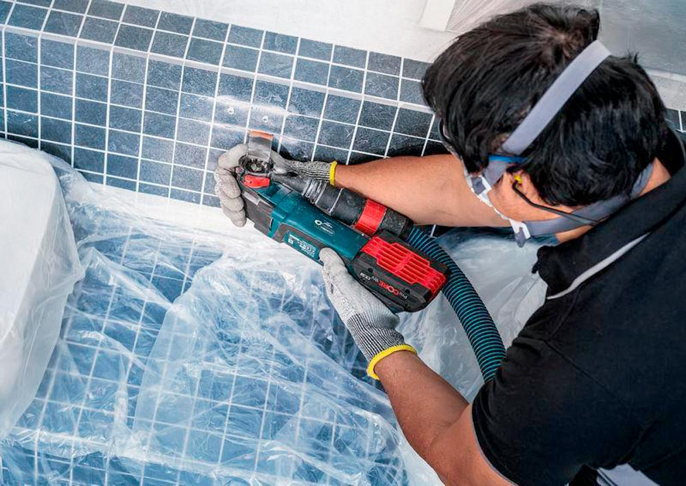 zum Entfernen von Fliesen und abrasive Materialien · duales Design: erledigt die Arbeit von zwei Standardblättern · erreicht die Fugen auch um kleine Fliesen herum und ermöglicht sauberes Abschleifen alten Mörtels · robustes Carbide-Korn