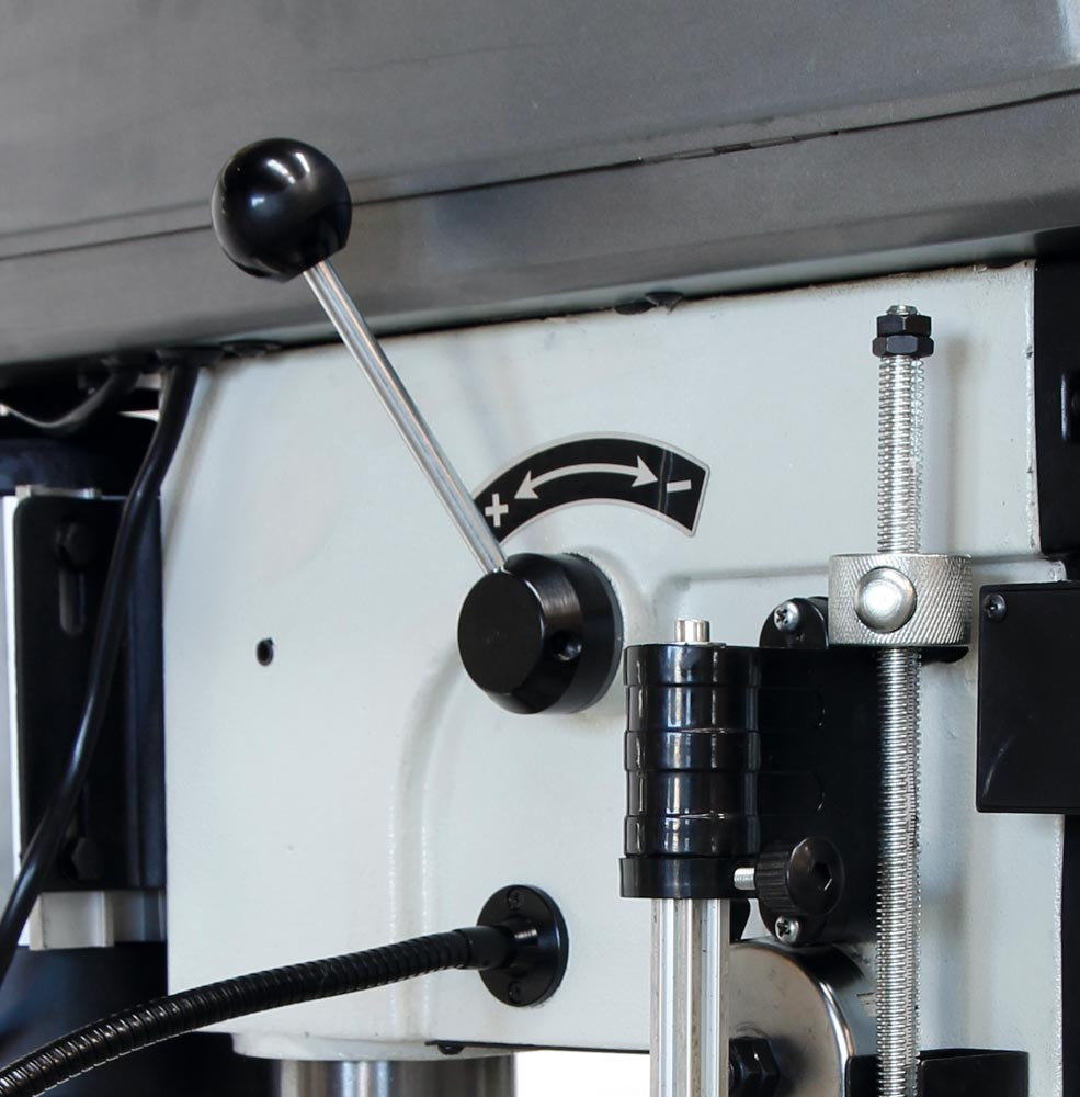Kompakte Tischbohrmaschine mit digitaler Drehzahlanzeige ∙ Präzise gearbeiteter, stabiler Bohrtisch mit diagonal verlaufenden T-Nuten und umlaufender Kühlwasserrinne ∙ Bohrtisch ± 45° neigbar und 180° drehbar ∙ Drehzahlverstellung mittels Variatorscheibe ∙ Laser-Bohranzeige für punktgeanues Bohren ∙ LED-Lampe im Bohrkopf integriert ∙ Rechtslauf