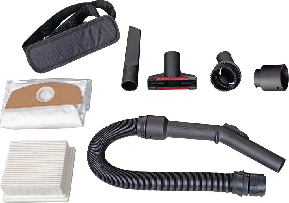 Lieferumfang: Saugschlauch 0,5-1,5 m DN 30,5 mit Anschluss und Griffstück, Vliesfilterbeutel, Luftfilter, Schultergurt, Fugendüse, Polsterdüse, Runddüse