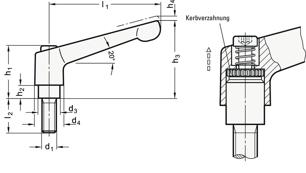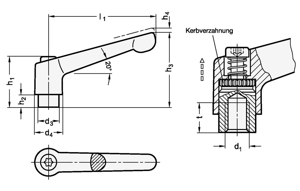 sind vorzugsweise dann einzusetzen, wenn der Spannbereich begrenzt der eine bestimmte Spannstellung erwünscht ist · durch Anheben (Ziehen) des Griffes wird die Kerbverzahnung frei und der Klemmhebel kann in die günstigste Spannposition geschwenkt werden · beim "Loslassen" rastet der Griff selbsttätig wieder ein · Griffkörper · Zink-Druckguss · Gewindebuchse und Halteschraube · Stahl, brüniert