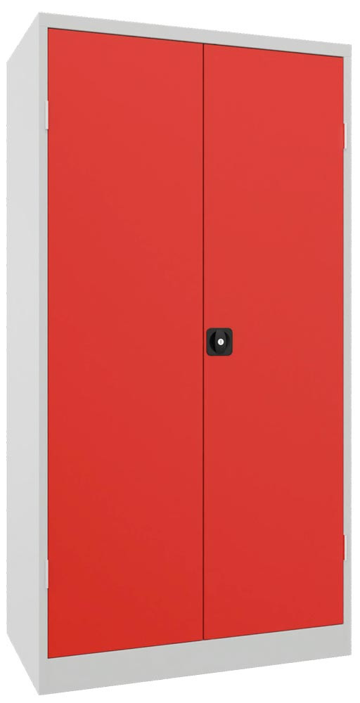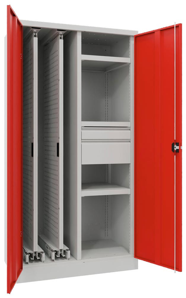 Vertikalauszugschrank, 2 Auszüge mit Lochplatten, Mitteltrennwand, 3 Böden, 2 Schubladen (1x100 mm, 1x200 mm), BxTxH 1000x600x1950 mm, RAL 5010 E6490186