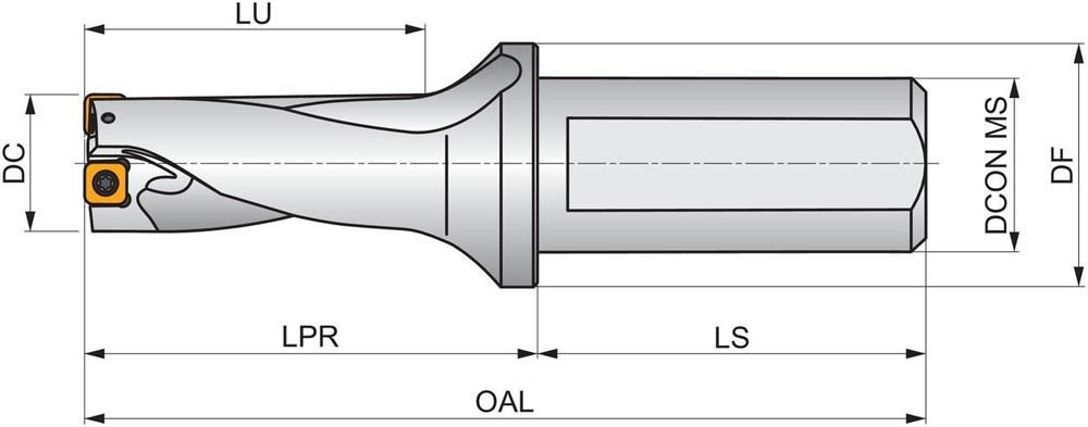 Wendeschneidplattenbohrer zum einsetzen von einer XPET 11T3.. Wendeschneidplatten als Zentrumschneide und einer SCET 09T3.. Wendeschneidplatte als Außenschneide · Bohrdurchmesser 1.250'' · mit einem 1.500'' abgeflachten Zylinderschaft nach ISO 9766 und Innenkühlung für maximale Bohrtiefen bis 2 x D