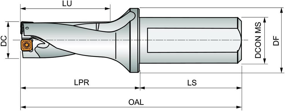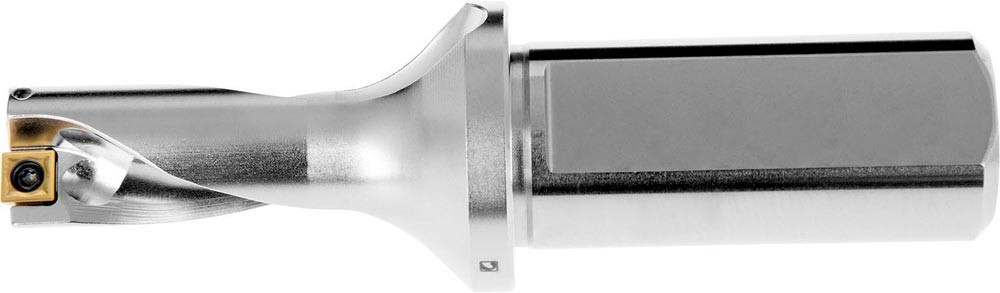 Wendeschneidplattenbohrer zum einsetzen von einer XPET 0602.. Wendeschneidplatten als Zentrumschneide und einer SCET 0502.. Wendeschneidplatte als Außenschneide · Bohrdurchmesser 19mm in Kombination mit EP253253 · geeignet für eine radiale Verstellung von -0.15 bis +0.45mm · mit einem 25mm abgeflachten Zylinderschaft nach ISO 9766 und Innenkühlung für maximale Bohrtiefen bis 2 x D