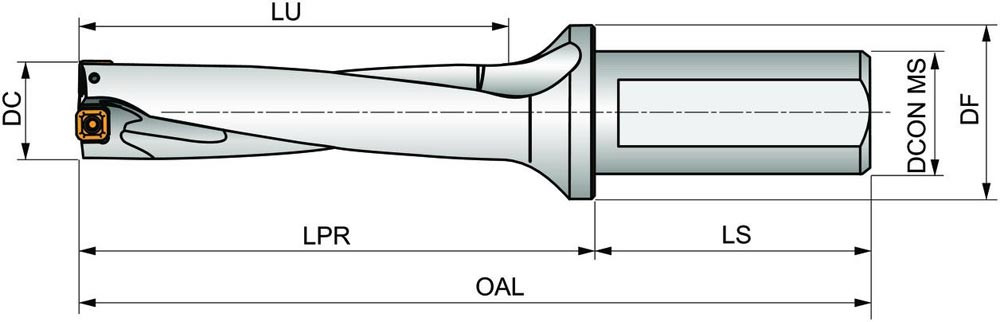 Wendeschneidplattenbohrer zum einsetzen von einer XPET 1504.. Wendeschneidplatten als Zentrumschneide und einer SCET 1505.. Wendeschneidplatte als Außenschneide · Bohrdurchmesser 49mm · mit einem 40mm abgeflachten Zylinderschaft nach ISO 9766 und Innenkühlung für maximale Bohrtiefen bis 4 x D