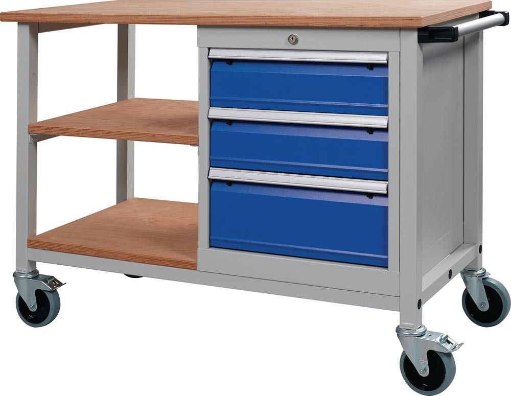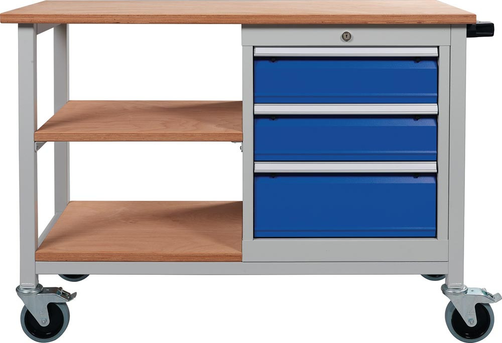 Werkbank B1200xT540xH880mm Buche Multiplex lichtgrau / signalblau 3 Schubladen E6461373