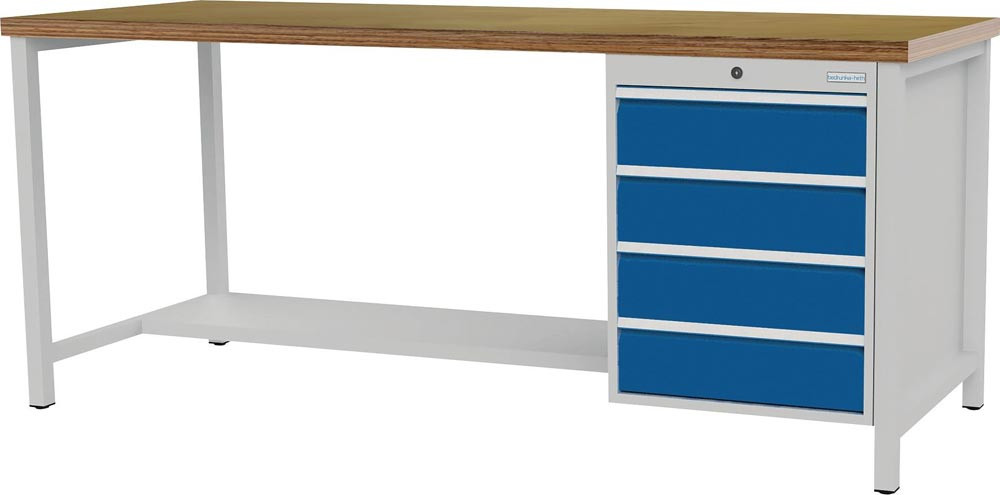 Werkbank signalblau lichtgrau B2000xH859xT750 mm Buche Multiplex 40 mm 4 Schubladen