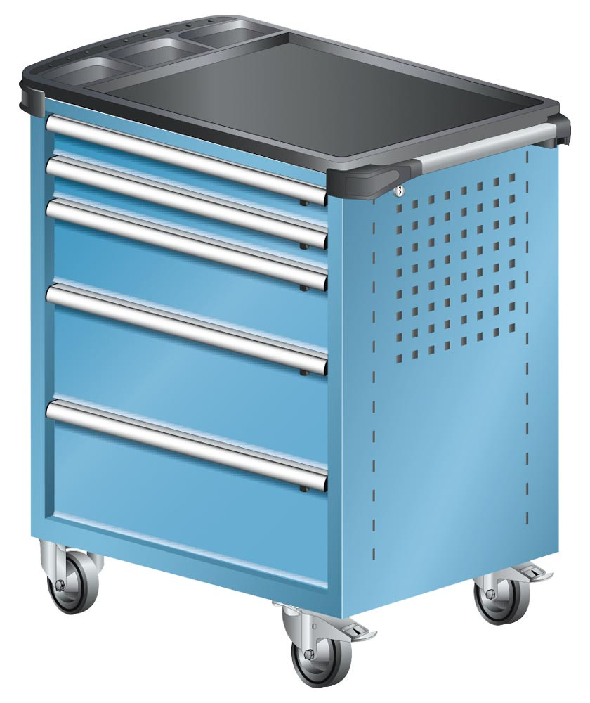 Werkstattwagen, 5 Schubladen: 2x75, 1x150, 2x200 mm VA, BxTxH 894x525x928 mm, Kunststoffabdeckung, fahrbar, RAL 5012 E6011374
