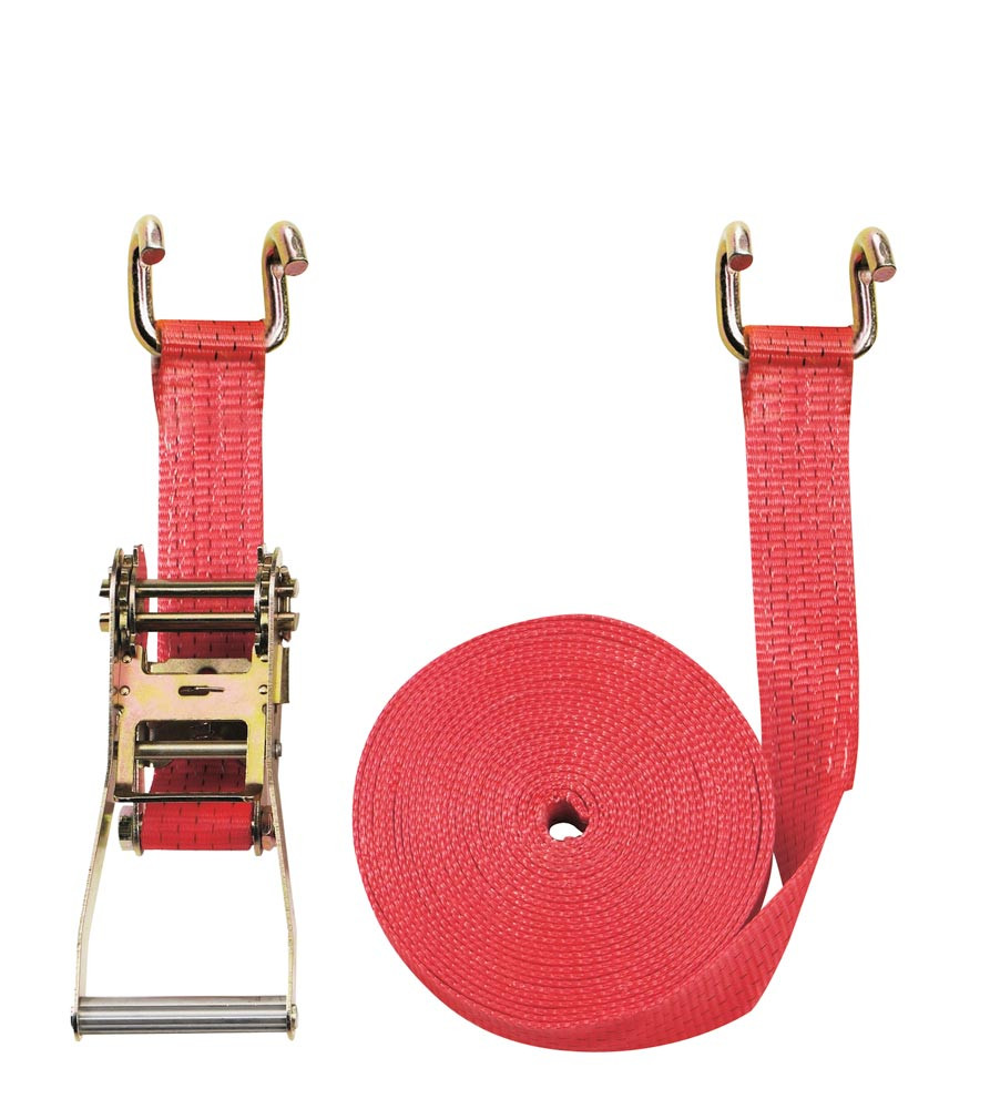Zweiteiliger Zurrgurt, mit Rahmenhaken, 5000 daN zul. Zugkraft in der Umreifung, Gurtbreite 50 mm, Länge 8 m, Farbe rot, 5 Streifen, VE 2 Stück
